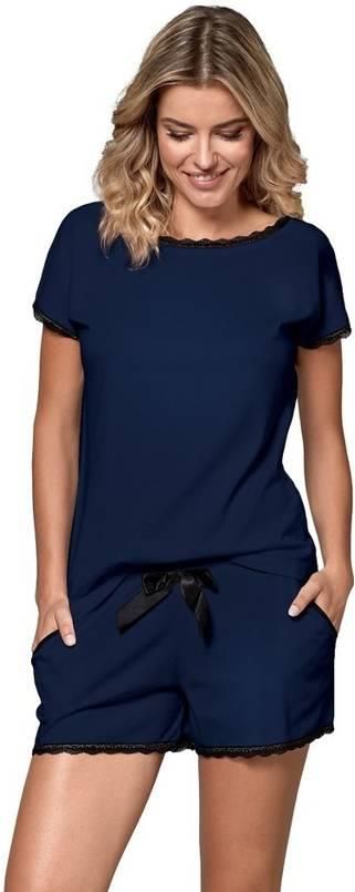 Piżama damska z krótkim rękawem i krótkimi spodenkami. Koszulka gładka w kolorze granatowym, rękawy zakończone czarną koronką. Spodenki posiadają satynową kokardkę, nogawki zakończone czarną koronką. Skład: 70% wiskoza, 14% poliamid, 8% elastan, 8% inne