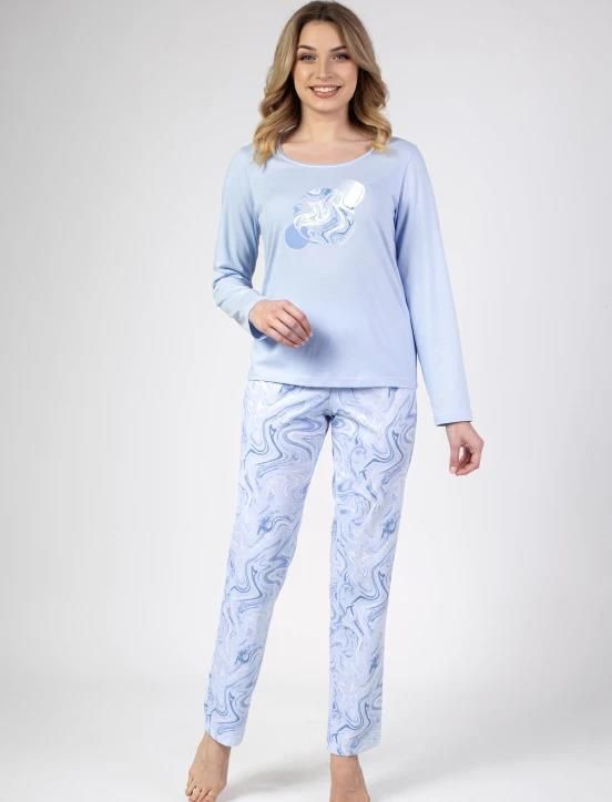 Piżama damska z wysokogatunkowej bawełny z długim rękawem i spodniami. Koszulka w kolorze niebieskim, dekolt półokrągły, na piersi nadruk. Spodnie długie, proste, wzorzyste. Skład: 100% bawełna