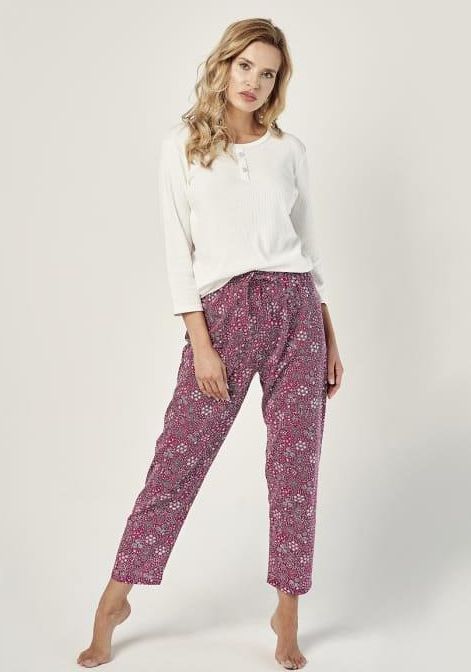 Komfortowa piżama damska wykonana z delikatnej bawełny. Koszulka w białym kolorze w prążki z rękawem 3/4. Dekolt ozdobiony aplikacją imitującą guziki. Do kompletu długie spodnie, wzorzyste z wygodną gumką w pasie oraz dodatkowo troczki. Skład: 100% bawełna