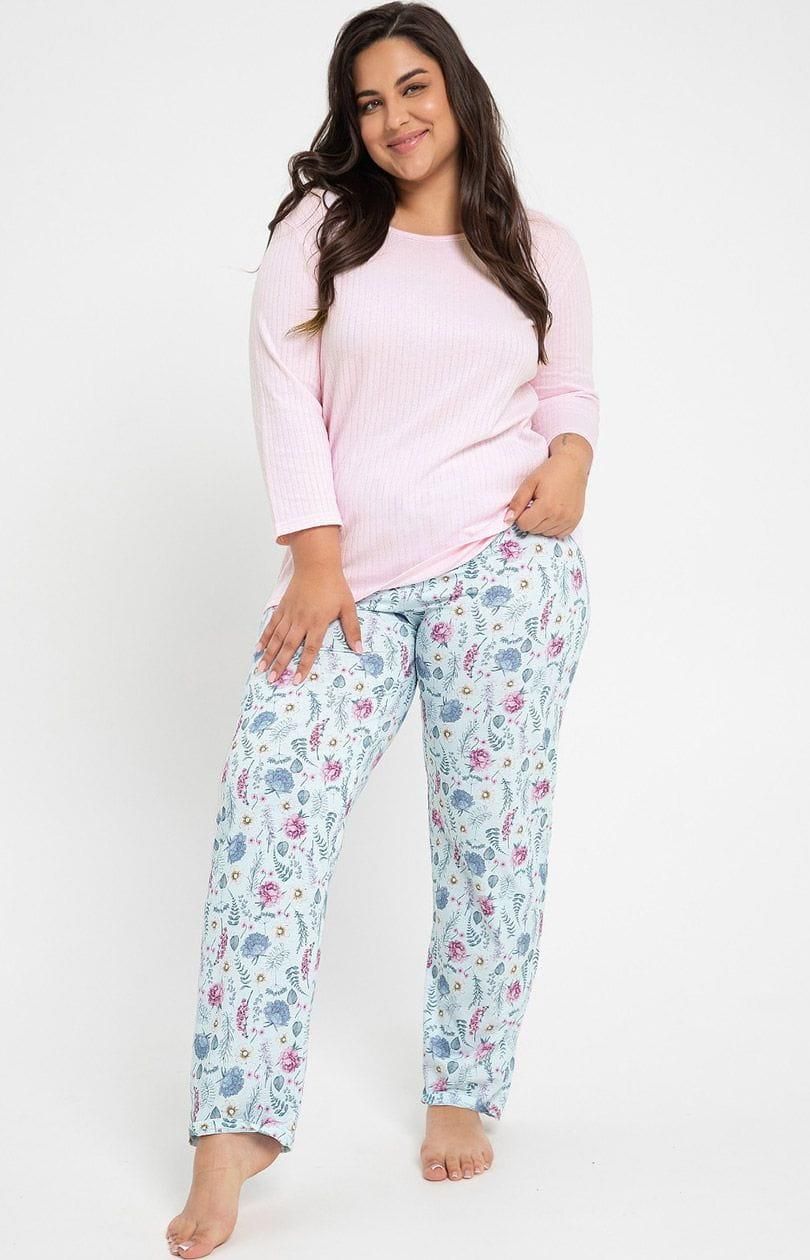 Komfortowa piżama damska wykonana z delikatnej bawełny. Koszulka w różowym, pastelowym kolorze w prążki z rękawem 3/4. Do kompletu długie spodnie w piękne, kwitowe wzory z wygodną gumką w pasie. Skład: 100% bawełna