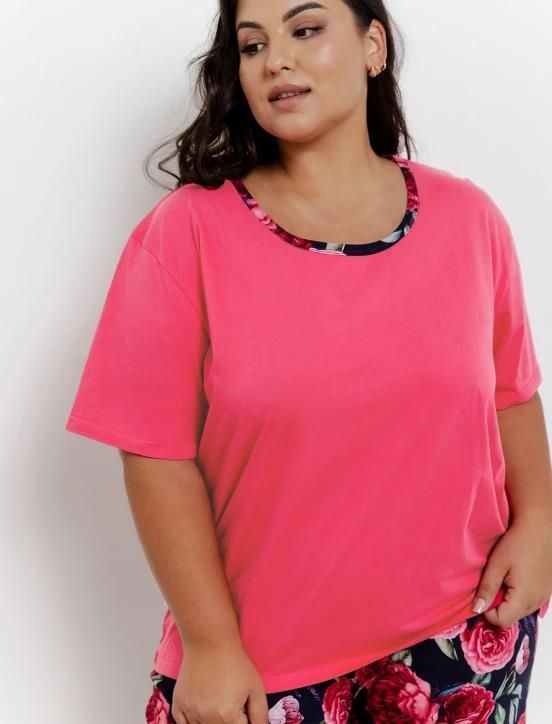 Piżama damska Taro z krótkim rękawem w dużych rozmiarach. Góra piżamy jednolita w kolorze fuksjowym, dekolt półokrągły obszyty kontrastową lamówką w kolorze spodni, rękaw krótki. Spodnie w kolorze granatowym, wzorzyste w kwiaty, długość 3/4, w pasie elastyczna gumka. Skład: 100% bawełny