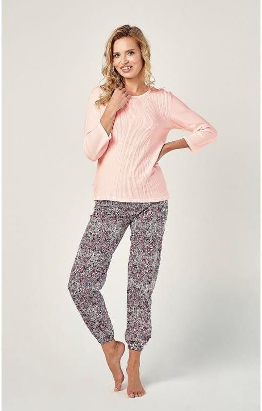 Komfortowa piżama damska wykonana z bawełny. Koszulka z rękawem o długości 3/4 w jasnoróżowym kolorze z prążkowanej bawełny. Spodnie długie, wzorzyste, nogawki zakończone gumką Skład: 100% bawełna