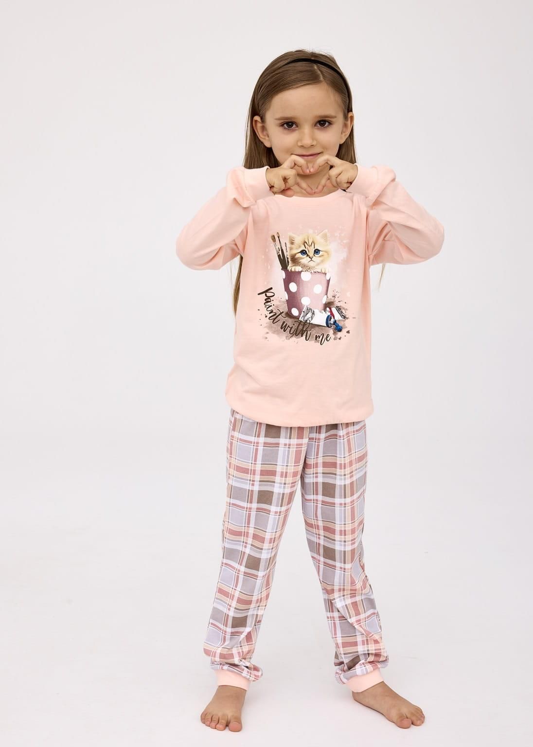 Piżama dziewczęca Cornette z długim rękawem. Koszulka w kolorze różowym, nadruk kota na piersi, rękawy oraz dół koszulki zakończone ściągaczami. Spodnie długie wzorzyste w różowo beżową kratę, zakończone ściągaczami, w pasie elastyczna gumka. Skład: 100% bawełna