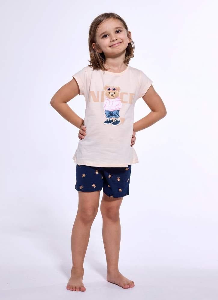 Piżama dziewczęca Cornette z krótkim rękawem wykonana z bawełny. Góra piżamy jednolita w kolorze morelowym, na piersi nadruk misia, dekolt półokrągły. Spodenki krótkie, granatowe, wzorowane w misie, w apsie elastyczna gumka. Skład: 100% bawełna