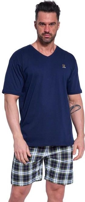 Piżama męska Cornette wykonana z wysokogatunkowej bawełny. Góra piżamy jednolita w kolorze ciemnego granatu, na piersi niewielki wyhaftowany wzór, dekolt w serek. Spodenki krótkie, wzorzyste w zielono-granatową kratkę, w pasie elastyczna gumka w tunelu. Skład: 100% bawełna