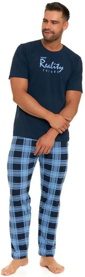 Piżama męska wykonana z bawełny z dodatkiem elastanu. Koszulka z krótkim rękawem, ozdobiona nadrukiem na piersi. Do kompletu długie spodnie w kratkę z kieszonkami i wygodną gumka w pasie. Skład: 95 % bawełna 5% elastan