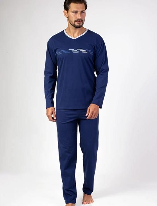 Piżama męska Regina wykonana z bawełny. Góra piżamy z długim rękawem, jednolita w kolorze granatowym z nadrukiem na piersi, dekolt w serek obszyty kontrastową lamówką. spodnie długie jednolite w kolorze granatowym, w pasie elastyczna gumka, nogawki proste. Skład: 100% bawełna