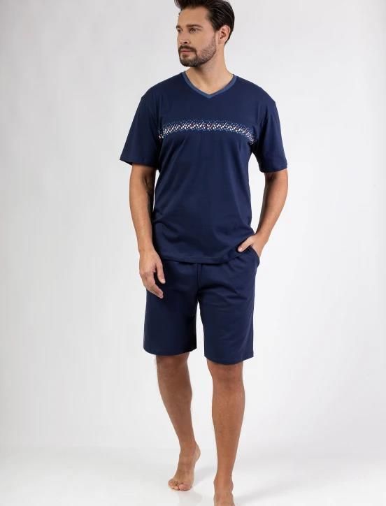 Piżama męska Regina z krótkim rękawem. Góra piżamy jednolita w kolorze granatowym, na piersi nadruk, dekolt V obszyty kontrastową lamówką. Spodnie krótkie, jednolite w kolorze granatowym, po bokach kieszenie, Skład: 100% bawełna