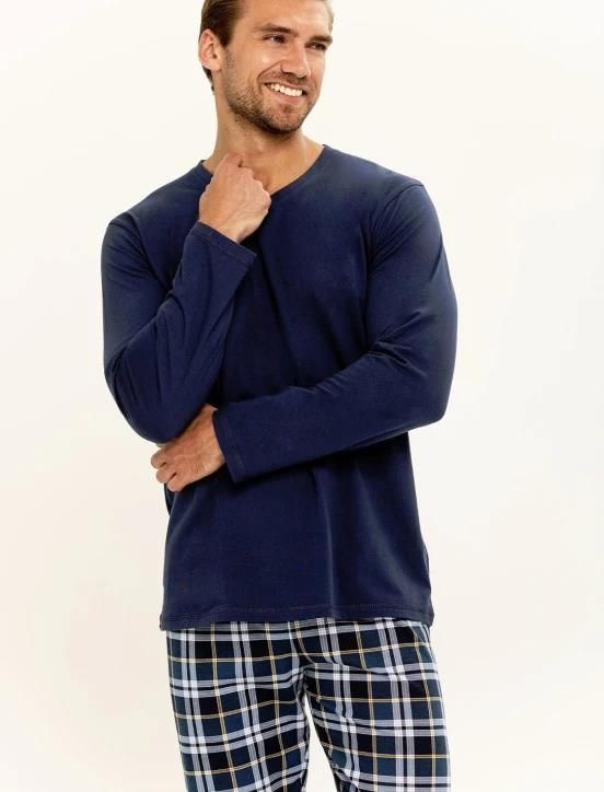 Piżama męska Taro wykonana z bawełny. Góra piżamy z długim rękawem, jednolita w kolorze granatowym, dekolt w szpic. Spodnie długie wzorowane w grantowo-żółtą kratę, nogawki proste, w pasie elastyczna gumka. Skład: 100% bawełna