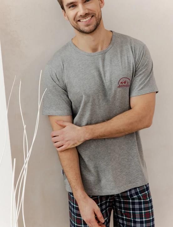 Piżama męska Taro z krótkim rękawem. Góra piżamy jednolita w kolorze szarego melanżu, na piersi niewielki nadruk, dekolt półokrągły. Spodenki krótkie wzorowane w granatowo-zieloną kratkę, w pasie elastyczna gumka. Skład: 100% bawełna