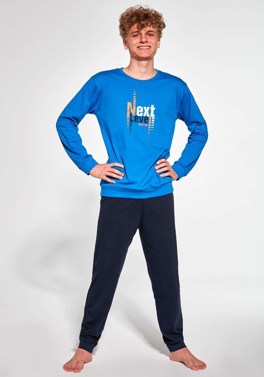 Wygodna piżama młodzieżowa chłopięca z długim rękawem. Bluzka w niebieskim kolorze, ozdobiona nadrukiem, rękawy zakończone ściągaczami. Do kompletu, długie, jednolite spodnie z nogawkami zakończonymi ściągaczami. W pasie wygodna gumka. Skład: 100% bawełna