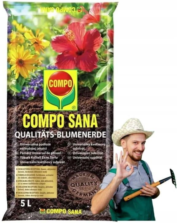Podłoże uniwersalne do roślin 5L Mieszanka torfu perlitu i dolomitu COMPO SANA to wysokiej jakości, uniwersalne podłoże stworzone z myślą o uprawie roślin domowych, balkonowych, tarasowych oraz ogrodowych. Dzięki specjalnie opracowanej recepturze, podłoże zapewnia optymalne warunki do wzrostu i rozwoju każdej rośliny. Zalety Odżywianie przez 8 tygodni – Startowa dawka nawozu zapewnia roślinom niezbędne składniki pokarmowe przez pierwsze tygodnie uprawy. Lepsza struktura gleby – Dodatek wulkanicznego perlitu poprawia napowietrzenie podłoża, co sprzyja lepszemu rozwojowi systemu korzeniowego. Aktywator korzeni – Wzmacnia rozwój korzeni, co przekłada się na zdrowsze i silniejsze rośliny. Ekologiczne składniki – Dodatek zielonego kompostu z kwasami humusowymi zwiększa żyzność i aktywność biologiczną gleby. Uniwersalne zastosowanie – Idealne zarówno do sadzenia, jak i przesadzania roślin ozdobnych i użytkowych. Parametry Pojemność: 5L pH: 5,0 - 6,5 Rodzaj: Uniwersalne podłoże ogrodowe Skład: Torf, perlit, agrosil, wapno Producent: COMPO GmbH