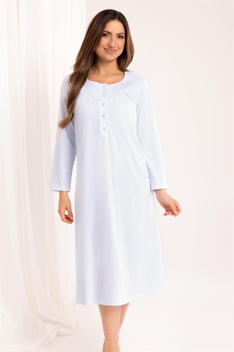 Koszula nocna damska 016 J/25 to klasyczny model stworzony z myślą o komforcie i funkcjonalności. Wykonana z wysokiej jakości, 100% bawełny zapewnia pełną oddychalność i miękkość dla skóry. Posiada długi rękaw oraz karczek z częściowym rozpięciem na guziczki, co ułatwia zakładanie i dodaje subtelnego uroku. Krój koszuli jest luźny i swobodny, dzięki czemu sprawdzi się zarówno do snu, jak i jako wygodna odzież domowa. Idealna także dla kobiet w ciąży lub karmiących mam.