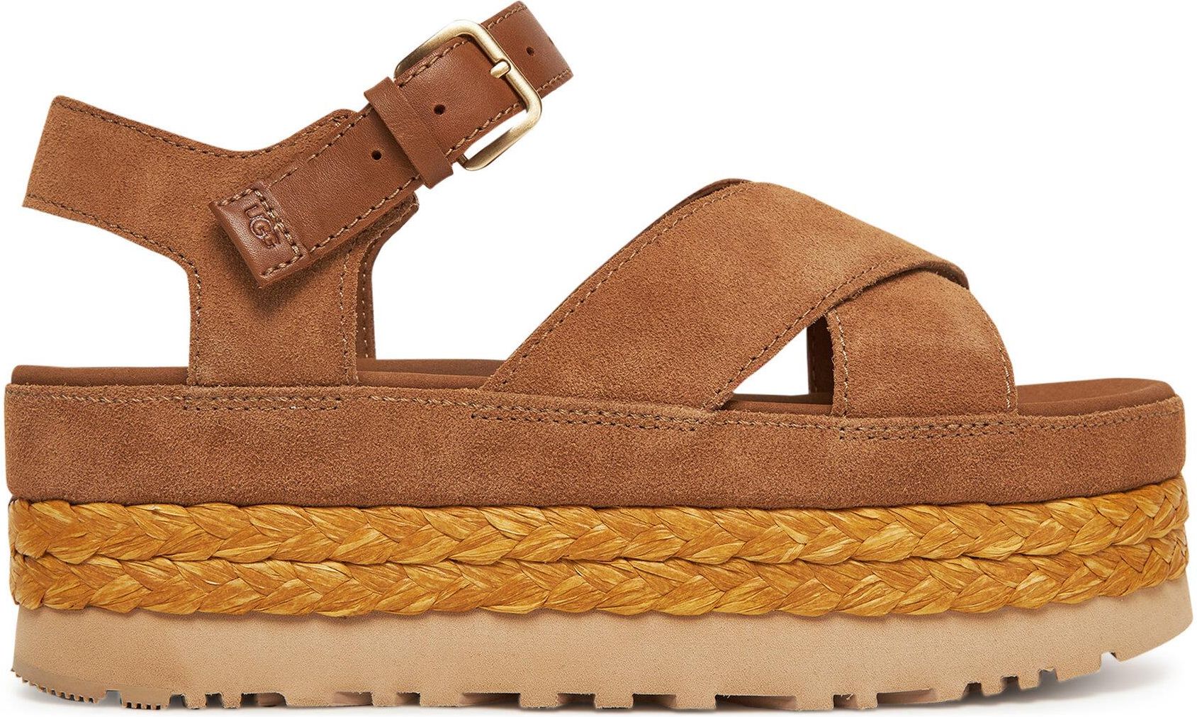 Sandały UGG w klasycznym brązowym kolorze to idealne połączenie stylu, komfortu i jakości. Wykonane z naturalnej, zamszowej skóry, zachwycają elegancją i trwałością. Koturn subtelnie podkreśla sylwetkę, zapewniając jednocześnie wygodę podczas noszenia. Zapięcie na sprzączkę umożliwia idealne dopasowanie do stopy, a zastosowana technologia EVA gwarantuje doskonałą amortyzację i lekkość na każdym kroku. Te sandały to niezastąpiony wybór na letnie dni – komfort i styl, który pokochasz!