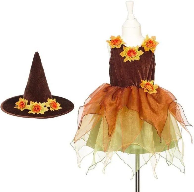 Kostium sukienka z kapeluszem czarownica Sabrina holenderskiej marki Souza! to przepiękne, kunsztownie wykonane przebranie dla dziewczynki. Zachwyca dbałością o detale, ma klasyczny krój i gumkę w pasie, która zapewnia komfort noszenia. Welurowa góra ma rdzawo-brązowy kolor i trzy jesienne kwiaty …