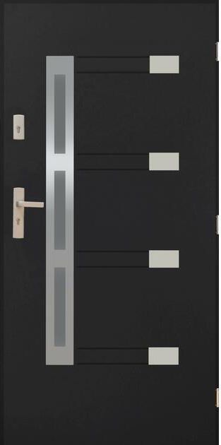 Drzwi stalowe zewnętrzne przeszklone, szer. 90, gr. 72 mm, ocieplone, wypełnienie: spieniony polistyren, szyba hartowana, komplet akcesoriów. Dane techniczne: Kolor: antracyt Wymiary: 99x206,5 cm Grubość: 72 mm Rodzaj: stalowe Typ: zewnętrzne Wyposażenie: ościeżnica, skrzydło, próg, zamki, komplet akcesoriów Zawiasy: 3 zawiasy 3D Uszczelki: 2 Grubość blachy: 0,5; 1,2 mm Kierunek: prawe