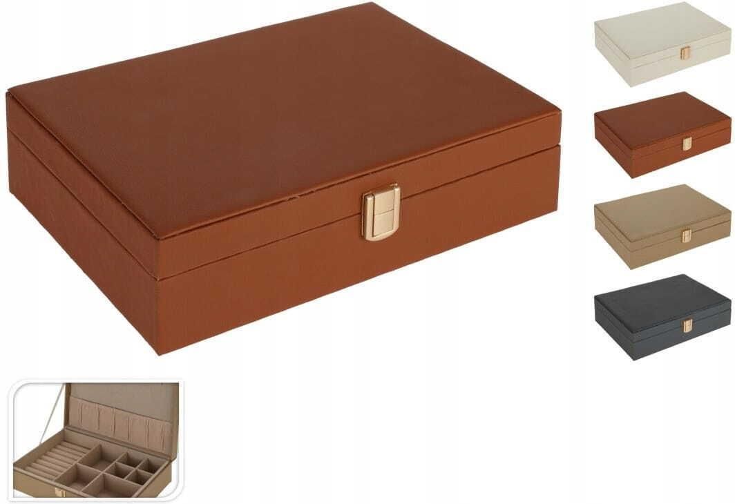 Szkatułka na biżuterię Szkatułka na biżuterię wykonana jest niezwykle starannie. Otwierana jest za pomocą dyskretnego uchwytu w kolorze złotym. Środek pudełka wykończony jest miękką tkaniną w kolorze beżowym. Posiada różnej wielkości przegródki, pozwalające dopasować do nich każdy rozmiar biżuterii. Całość wykonana jest z dbałością o szczegóły i prezentuje się bardzo elegancko. Pudełko świetnie sprawdzi się jako prezent dla kobiety jak i dla mężczyzny! Informacje Wymiary: 28 x 7 x 19 cm Materiał: Tworzywo sztuczne Zastosowanie: Do przechowywania biżuterii, naszyjników Kolor: biały, brązowy, beżowy, czarny Zalety Szkatułka jest praktyczna i pojemna. Modny, a zarazem uniwersalny design. Trwały materiał i staranne wykonanie! UWAGA! Produkt występuje w różnych wersjach kolorystycznych, prosimy o zawarcie informacji o kolorze w uwagach, w przeciwnym razie wysyłamy losowy kolor, dostępny w magazynie!