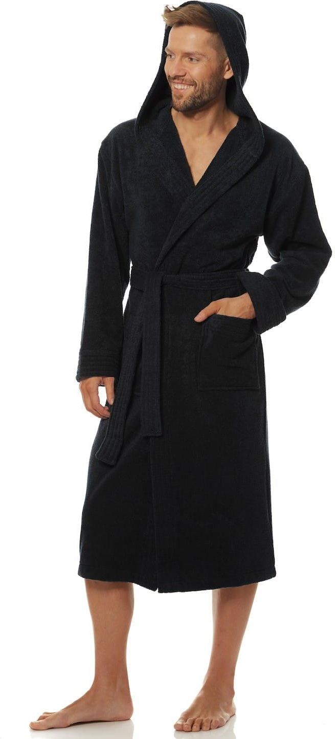 Komfortowy szlafrok męski, wykonany z miłej w dotyku bawełny z kapturem. W pasie wiązanie, po bokach praktyczne kieszenie Skład: 100% bawełna