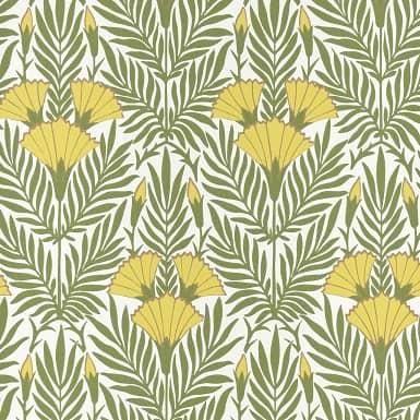 Tapeta 1838 Wallcoverings V&A 2311-171-01 Tapeta pochodzi z kolekcji zainspirowanej archiwalnymi wzorami pochodzącymi ze zbiorów Victoria & Albert Museum w Londynie. Elegancki wzór zaczerpnięty z XIX-wiecznego projektu tapety z archiwum V&A. Złożony z motywów kwiatowych w kształcie wachlarza w układzie delikatnych liści, cała powierzchnia zadrukowana, aby zachować efekt ręcznie malowanego. Doskonały w swojej prostocie, kunszt jest dodatkowo wzmocniony mocnymi, świeżymi kolorami, aby nadać temu trwałemu projektowi powiew nowoczesności. W żywej, żywej żółci kwiaty mają delikatny zarys miękkiego złota. Autorem wzoru jest George Charles Haité projektant inspirował się naturą, redukując kwiaty i liście do serii formalnych, symetrycznych kształtów. Haité, niezwykle utalentowany artysta i ilustrator, zaczął projektować tapety w latach 70. XIX wieku i tworzył projekty dla różnych firm, w tym Jeffrey & Co., Essex & Co., William Woollams i Arthur Sanderson & Sons. Styl pracy Haité przecina ruchy Arts and Crafts i Art Nouveau, a tutaj efekt dekoracyjny również przypomina efektowny styl Art Deco.Dugość: 10 mSzerokość: 52 cmPrzesunięcie wzoru: 42.5 cm