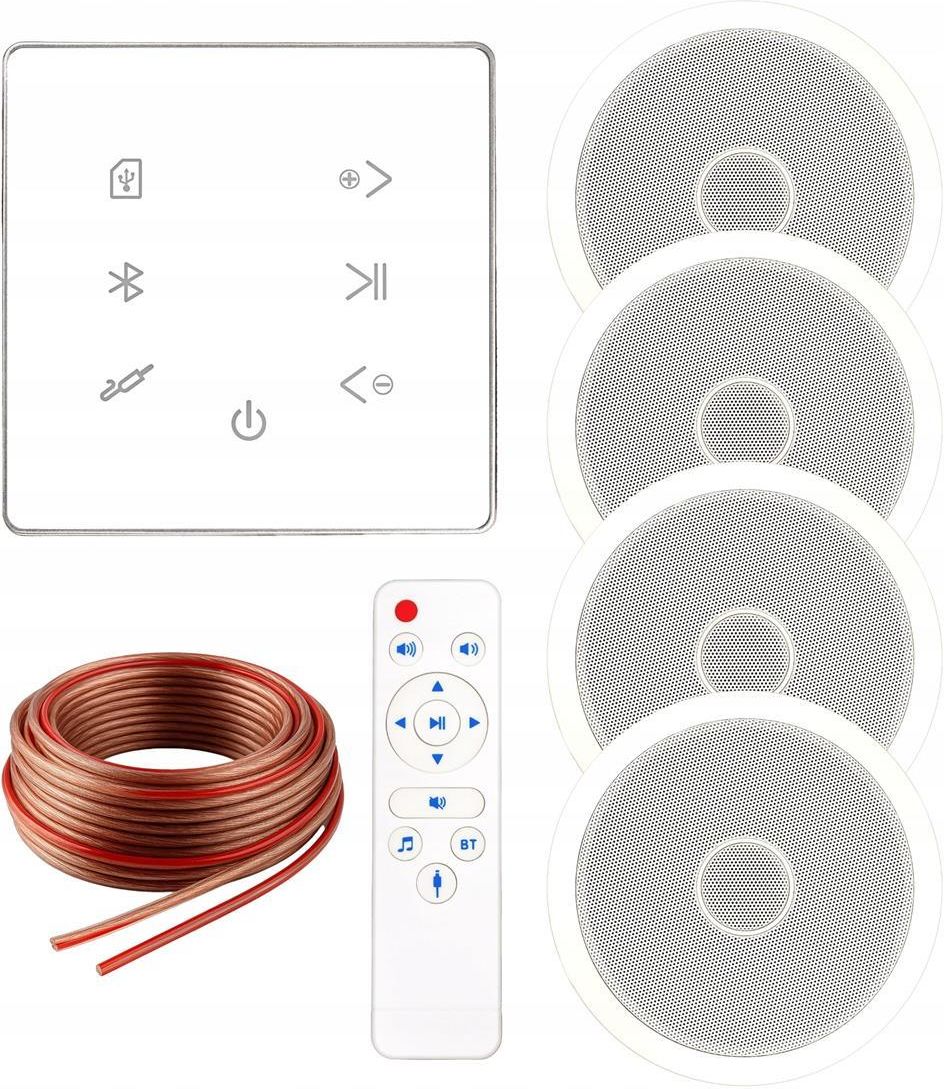 Zestaw nagłośnienia sufitowego MusicMate MM-SN300-W InvisiaSound Obsługa Bluetooth i USB, odtwarzanie z microSD Panel dotykowy z podświetleniem, sterowanie muzyką, pilot w zestawie Wbudowana moc RMS 40W – czysty i zbalansowany dźwięk 4 głośniki sufitowe o mocy 40W każdy, impedancja 8Ω Zestaw …