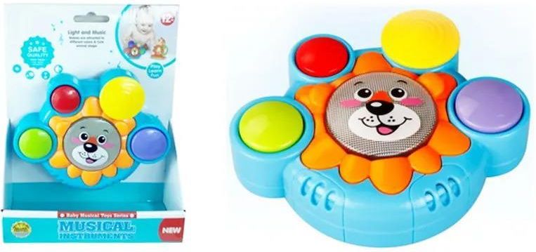 Interaktywna zabawka muzyczna w z wizerunkiem lwa z kolorowymi przyciskami. Wyposażona w efekty świetlne i dźwiękowe, aktywowane po naciśnięciu przycisków. Zabawka działa na baterie typu AA. Baterie nie są załączone do zabawki. Produkt zapakowany w kartonowe opakowanie. Podane wymiary są wymiarami opakowania. Zabawka przeznaczona dla dzieci od 12 miesiąca życia.