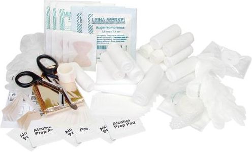 Wkład opatrunkowy do apteczek pierwszej pomocy wg DIN 1357 PLUS.Kompletny zestaw opatrunkowy wg normy DIN 13157, m.in. plastry, bandaże, gaziki, rękawiczki jednorazowe, nożyczki, a także środki do dezynfekcji. Wszystkie wkłady są starannie zapakowane, co gwarantuje ich długotrwałą świeżość i gotowość do użycia w każdym momencie.Zastosowanie: szkoły, dom, firmy, biura, pensjonaty, gospodarstwa agroturystyczne, zakłady przemysłowe itp.Termin ważności wkładu 5 lat Skład zestawu uzupełniającego do apteczek wg DIN 13157: Zastosowanie: szkoły, domowa, małe firmy, biura, pensjonaty, gospodarstwa agroturystyczne, zakłady przemysłowe itp. Zestaw do apteczki może być stosowany zarówno w apteczkach samochodowych, jak i w biurach czy zakładach przemysłowych. W przypadku znacznej liczby osób zaleca się stosowanie wielokrotności standardowego zestawu wyposażenia. Wyrób spełnia wymagania norm Unii Europejskiej To jest wyrób medyczny. Używaj go zgodnie z instrukcją używania lub etykietą.