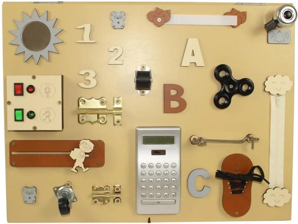 Tablica naturalna HIT!!!! ELEKTRONIKA - PRZEJŚCIE DLA PIESZYCH: CZERWONE I ZIELONE ŚWIATŁO zamek błyskawiczny nietłukące lusterko umieszczone w słoneczku dzwonek rowerowy dwa rodzaje zasuwek but ze sznurówką (nauka sznurowania) cyferki drewniane różnokolorowe literki ruchome i obrotowe kółka do …