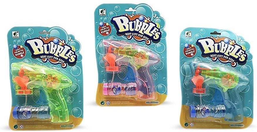 W zestawie: pistolet na bańki mydlane wym. 15 x 15 x 4,5 cm, 2 płyny 55 ml., funkcje pistoletu: wytwarzanie baniek mydlanych, efekty świetlne, 3 kolory: niebieski, zielony, różowy - wysyłka losowo wym. opak. 20 x 28 x 5 cm, baterie: 2 x AG13, dołączone, 3+ Grupa wiekowa: 3+ Opakowanie: blister