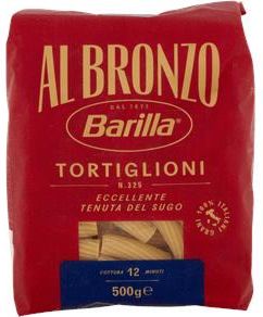 Barilla Al Bronzo Tortiglioni n.325 500g włoski makaron rurki Cechą charakterystyczną makaronu Tortiglioni są żłobienia, które nadają mu elegancji i ruchu, czyniąc go smaczniejszym. Dzięki specjalnemu surowemu brązowi, ich grubość i konsystencja pozwalają na przeżycie niepowtarzalnych doznań …