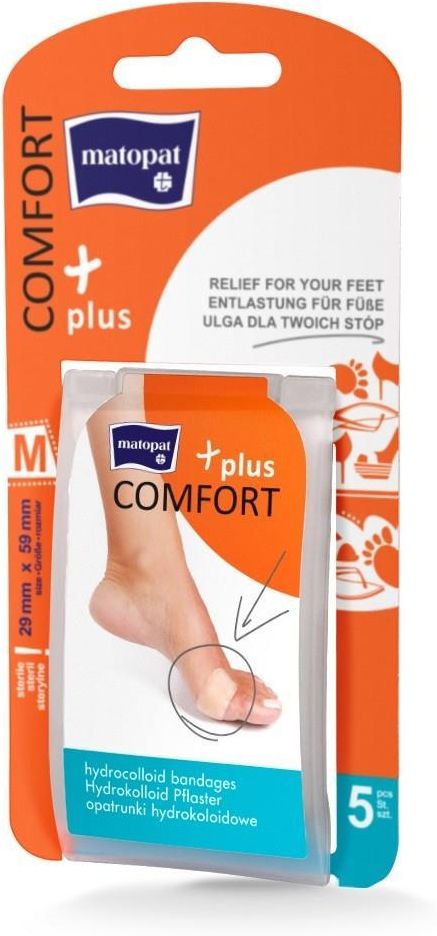 Etykieta, oznakowanie, instrukcja obsługi oraz interfejs użytkownika są w języku polskim Certyfikat CE 2797 Produkt zawiera deklarację zgodności UE Oferowany produkt jest wyrobem medycznym jednorazowego użytku oznaczonym znakiem CE. Używaj go zgodnie z instrukcją używania lub etykietą. Wodoodporne plastry Comfort Plus wspomagające gojenie się pęcherzy i odcisków powstałych np. na skutek otarć przez nowe buty. Doskonałe również w profilaktycznym zapobieganiu stopy przed uciskiem. Właściwości Wspomagają gojenie się pęcherzy. Chronią przed otarciami, uciskami. Posiadają warstwę hydrokoloidową, która tworzy na ranie wilgotne środowisko minimalizujące odczucie bólu i przyspiesza proces gojenia. Chłonne. Wodoodporne. Jak stosować Plastry należy stosować na czystą i suchą skórę zmieniając je tak często jak jest to konieczne, ale przynajmniej raz na 7 dni. Podczas ich usuwania należy rozciągnąć ich strukturę na płasko wzdłuż skóry. Nie należy odrywać w górę.