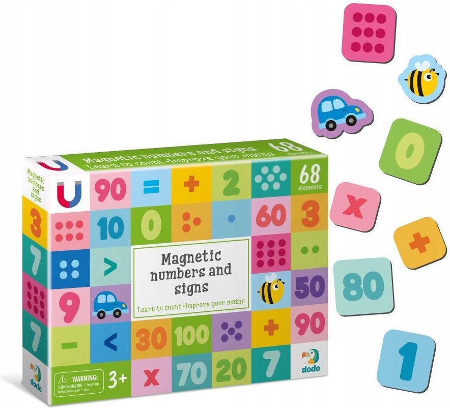 Duży zestaw magnetyczny DoDo Magnetyczne cyfry i znaki to świetny sposób, aby nauczyć dziecko podstaw matematyki poprzez zabawę. Zestaw składa się z elementów magnetycznych obejmujących cyfry, symbole matematyczne (dodawanie, odejmowanie, mnożenie i inne), a także urocze figurki pszczół i maszyn liczących. Cechy: rozmiar magnesów jest wygodny dla rączek dzieci każdy magnes jest dobrze narysowany magnesy łatwo przyczepiają się do lodówki lub tablicy magnetycznej jasny design wspomaga rozwój koncentracji i podstawowych umiejętności liczenia, co przyda się w dalszej nauce matematyki Zawartość opakowania: elementy magnetyczne - 68 szt.