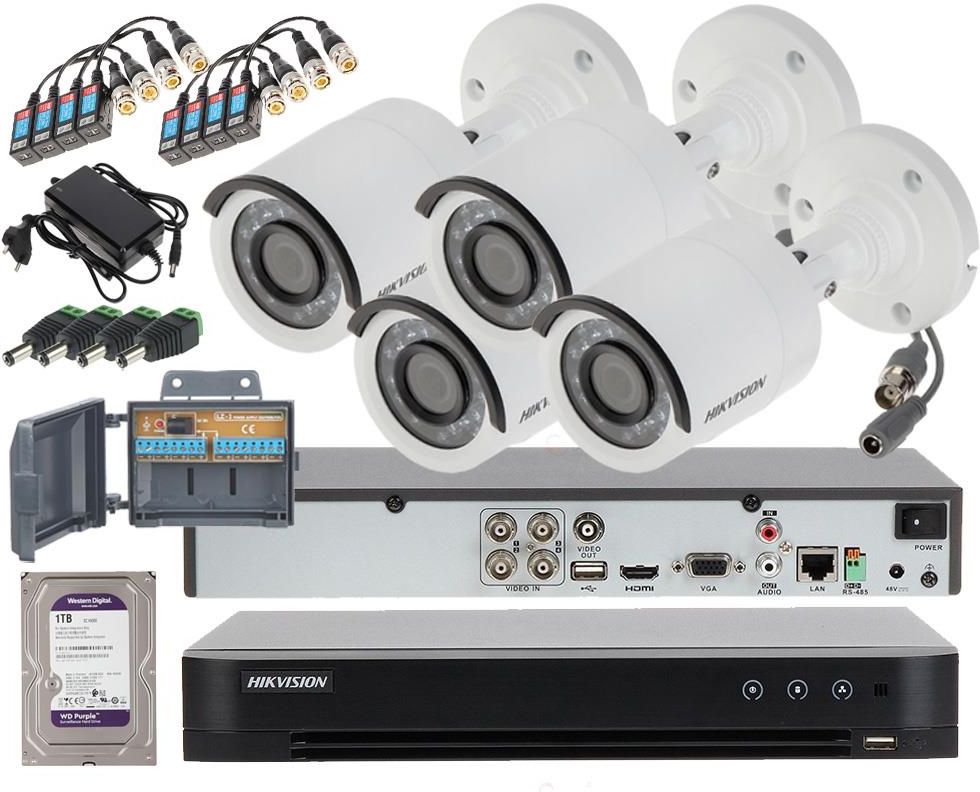 Zestaw monitoringu zawiera: 4x Kamera tubowa Hikvision DS-2CE16D0T-IR(2.8mm)2 Mpx FullHD 1080p, 4-kanałowy rejestrator Hikvision IDS-7204HQHI-M1/S, 1x Zasilacz do kamer + rozdzielacz zasilania, 8x Transformator video TR-1D-UHD 1x Dysk do monitoringu (nagrywanie 24/7)- Western Digital Purple 1TB, Komplet złącz i wtyków do wyboru na przewód UTP lub koncentryczny.