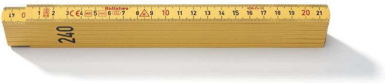 Miara składana G59 2,4 Hultafors Miara skłądana o długości 240 cm wykonana z poliamidu wzmocnionego włóknem szklanym, dzięki czemu jest odporna na wilgoć, trwała i ma wydłużoną żywotność. Dzięki dodatkowej długości 40 cm jest dostosowana do mierzenia, np. płyt gipsowo-kartonowych, wysokość sufitu i drzwi bez konieczności przesuwania, aby zakończyć pomiary. Podziałka metryczna z centymetrami / milimetrami w kolorze czarnym po obu stronach i czerwona decymetrowa dla ułatwienia odczytu. 2,4 m długości - większy pomiar. Wszystkie przeguby blokują się w położeniu 90° Odporna na wilgoć. Wytłaczana na folii skala zapewnia zwiększoną ochronę przed zużyciem. EU klasa III – klasa dokładności.