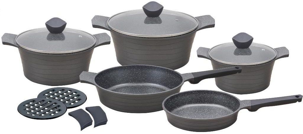 ZESTAW 12 ELEM. GARNKÓW GRANITOWYCH KLAUSBERG KB-7356 FRESCO KB-7356 12 elementowy zestaw garnków z niezwykle trwałą powłoką granitową - Nadają się do wszystkich rodzajów kuchenek: gazowych, elektrycznych, ceramicznych, halogenowych i indukcyjnych. - Potrójna warstwa marmurowa. - Niezwykle odporna na zarysowania. - Można w nich przygotować pyszne i zdrowe potrawy, które nie utracą soczystości i walorów odżywczych. Cechy: Silikonowe nakładki na uchwyty Powłoka marmurowa: wewnętrzna Wolna od PFOA i PTFE Można myć w zmywarce. Wykonane z kutego aluminium Nowoczesny, minimalistyczny design Zestaw w kolorze szarym W zestawie: - Garnek z pokrywką Ø28x12,5 cm, 6,0 L - Garnek z pokrywką: Ø24x11,5 cm, 4,1 L - Garnek z pokrywką: Ø20x9,5 cm, 2,4 L - Patelnia Ø24x5,5 cm, 2,0 L - Patelnia głęboka Ø28x7,5 cm, 3,7 L - 4 szt. silikonowa osłona uchwytu Granitowa powłoka non-stick jest wzbogacona miałem granitowym, dzięki czemu uzyskuje większą twardość. Jest twardsza niż teflon, ale przy tym zachowuje jego zalety: nie przypala, dobrze rozprowadza ciepło. Łączy zalety naczyń żeliwnych i teflonowych. Ma wszelkie zalety teflonu, ale jest bardziej odporna na uszkodzenia, przewyższa w tym nawet powłoki ceramiczne. Ten typ garnków i patelni pozwala również na smażenie przy użyciu minimalnej ilości tłuszczu, ponieważ naczynie rozgrzewa się podobnie do kamienia i oddaje ciepło całą swą powierzchnią. Parametry Wysokość: 30 Długość: 60 Szerokość: 30 Kod CN: 76151010