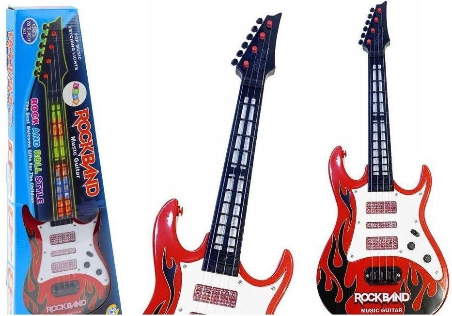 Gitara Elektryczna Dla Dzieci Światła Melodie Czerwona Elektryczną gitarę dla dzieci w żywym, czerwonym kolorze, idealną do wprowadzenia najmłodszych w świat muzyki. Gitara przyciąga uwagę nie tylko swoim designem, ale także kolorowymi efektami świetlnymi, które dodają każdemu występowi wyjątkowego uroku. Te świetlne efekty to doskonały sposób na stworzenie prawdziwej koncertowej atmosfery w domowym zaciszu. Instrument jest wyposażony w wgrane melodie, które umożliwiają dzieciom grę na gotowych podkładach muzycznych. Dzięki temu mogą one eksperymentować z różnymi dźwiękami i rozwijać swoje zdolności rytmiczne. Melodie te mogą także inspirować do tworzenia własnych kompozycji i improwizacji. Dodatkowym atutem gitary jest opaska na ramię, która pozwala dziecku wygodnie przewiesić instrument, co ułatwia grę na stojąco. Jest to nie tylko funkcjonalne, ale także daje młodym muzykom poczucie profesjonalizmu i swobody ruchu. Gitara jest lekka i dostosowana do małych dłoni, co sprawia, że jest łatwa w obsłudze nawet dla najmłodszych dzieci. To doskonały wybór dla początkujących muzyków, który łączy naukę z zabawą. Gitara rozwija kreatywność, wyobraźnię i umiejętności muzyczne, stanowiąc jednocześnie świetne narzędzie do wyrażania siebie i rozwijania pasji muzycznej. Gitara zasilana jest na baterie 3x 1.5V AA, które nie są elementem zestawu. Wymiary gitary 54cm x 17,5cm x 4,5cm Wymiary opakowania 55cm x 20cm x 6cm Posiada certyfikat CE, ponadto jest zgodny z normą EN71. Przeznaczony dla dzieci powyżej 3 roku życia. Informacje o produkcie Ostrzeżenie! Nieodpowiednie dla dzieci w wieku poniżej 3 lat Płeć Uniseks Wiek +3 Długość towaru w centymetrach 55 Wysokość towaru w centymetrach 6 Szerokość towaru w centymetrach 20 Waga gabarytowa w gramach 1100