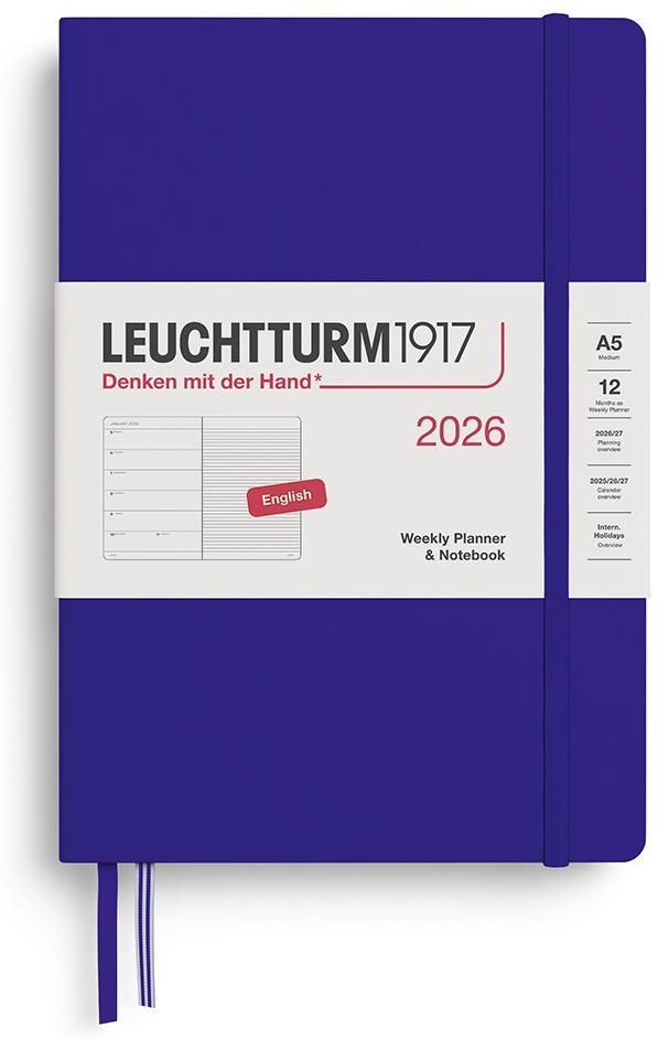 Kalendarz tygodniowy z notatnikiem Leuchtturm1917 (A5) na rok 2026 Planer tygodniowy Leuchtturm1917 w rozmiarze Medium (A5) w kolorze Ink. Stworzony z myślą o tych, którzy cenią dobrą organizację i elegancję. Cały tydzień znajduje się na jednej stronie (7 dni na stronie), a obok dołączona jest dodatkowa strona na notatki - – idealna na zadania, pomysły czy listy. Planer tygodniowy rozpoczyna się od stycznia 2026 i kończy na grudniu 2026 roku. Dodatkowo zawiera przegląd roku 2026, 2027 i 2028 i planer projektów. Przy datach umieszczono fazy księżyca i święta międzynarodowe. W twardej oprawie z rozkładaną kieszenią na notatki w okładce, dwoma wstążkowymi zakładkami dla lepszej organizacji i naklejkami do archiwizacji. Dodatkowe perforowane strony na notatki, pozwalające na czyste wyrwanie. Elastyczne zamknięcie. Szyty grzbiet umożliwiający wygodne, płaskie otwarcie. Bezkwasowy papier 80g/m2 doskonały do pisania piórem wiecznym. Rozmiar: Medium 145 x 210 mm.