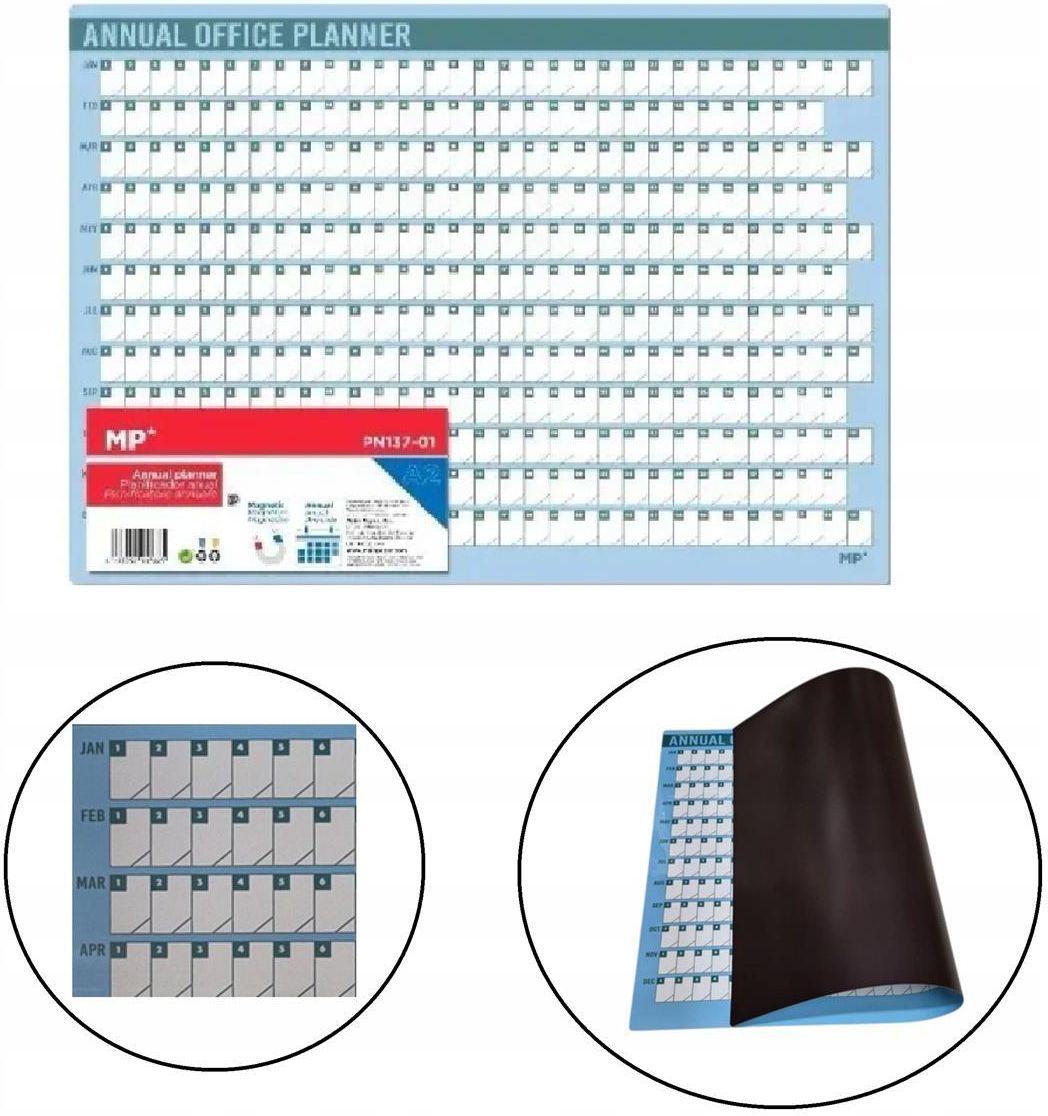 MP TABLICA MAGNETYCZNA ROCZNA PLANER A2 Przedstawiamy magnetyczny planer roczny w formacie A2 marki MP. To wyjątkowe narzędzie sprawi, że organizacja obowiązków i planowanie stają się niezwykle proste i przyjemne. Planer zaprojektowano z myślą o tych, którzy cenią sobie wygodę oraz funkcjonalność. Idealne Rozwiązanie na Każdy Dzień Dzięki dużemu formatowi A2, planer dostarcza dużo miejsca na notatki, zadania i wydarzenia. Ułatwia zatem kontrolowanie czasu i realizację postanowień. Jego magnetyczna powierzchnia umożliwia łatwe mocowanie na różnych metalowych powierzchniach, takich jak lodówka czy tablica biurowa. Praktyczność i Funkcjonalność w Jednym Planer jest nie tylko praktyczny, ale także niezwykle estetyczny. Pasuje do każdego wnętrza, sprawiając, że planowanie staje się bardziej inspirujące. To doskonały wybór dla osób, które chcą zapanować nad swoim harmonogramem, nie rezygnując przy tym z porządku i stylu.