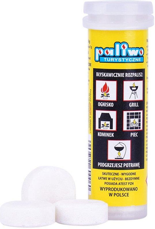 Paliwo Turystyczne - to produkt stały w postaci białych tabletek, tzw. "suchy spirytus" zapakowanych w szczelnej tubie PE z nasadką. nie zawiera związków ropopochodnych i nie jest toksyczne, jest łatwopalne , bez problemu zapala się od zapałki lub zapalniczki, jest całkowicie "niewybuchowe", nie iskrzy podczas spalania, pali się bezdymnym, bezwonnym płomieniem, wypala się prawie całkowicie - zostaje odrobina popiołu, nie wyleje się i nie ulegnie samozapłonowi, czas palenia: 8-10 min. ilość sztuk w opakowaniu: 8. waga 1 tabletki: 7g Paliwo Turystyczne paląc się emituje wysoką temperaturę, co umożliwia szybkie podgrzanie posiłku lub ugotowanie kubka wody na herbatę, kawę lub rosół. Paliwo stałe w kostkach jest łatwe do przechowywania i transportu (można przewozić je samolotami, ale należy upewnić się u przewoźnika). Paliwo Turystyczne kilka lat zachowuje swoje właściwości przechowywane w szczelnej torebce ze strunowym zamknięciem. Paliwo Turystyczne w kostkach może być używane z PODSTAWKAMI DO PODGRZEWANIA firmy WOJKOM lub jako wkład do kuchenek-podstawek innych producentów.