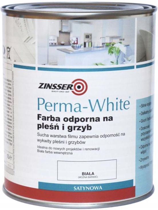 PERMA-WHITE - FARBA NA PLEŚŃ I GRZYB BIAŁA 1L SATYNOWA Pleśnioodpoma farba łazienkowa PERMA-WHITE to farba wodna przeznaczona specjalnie do niekorzystnych warunków, jakie zwykle panują w łazienkach i kuchniach. PERMA-WHITE zapewnia wykończenie odporne na pleśń i wilgoć, które przez wiele lat nie traci dobrego wyglądu. Łazienki wymagają farb, które potrafią wytrzymać wysoką wilgotność i częste zmiany temperatury. Para wodna skrapla się i gromadzi na ścianach i suficie łazienki, sprzyjając wzrostowi pleśni. Nadmiar wilgoci może ponadto przeniknąć pod konwencjonalne błony farby. Przenikanie wilgoci osłabia farbę, która w rezultacie pęka i łuszczy się. Receptura PERMA-WHITE zapobiega tym częstym kłopotom. Wg. naszej opinii jej unikalne, bezpieczne składniki zapobiegają wzrostowi pleśni na powierzchni farby nawet w najbardziej niesprzyjających warunkach. PERMA-WHITE zagruntowuje i uszczelnia powierzchnie porowate, tj. istniejące matowe powłoki malarskie, nowe płyty ścienne i ich złącza, zapewniając gładkie i jednolite podłoże, które chroni przed pleśnią i wilgocią. Żadna inna farba podkładowa nie jest potrzebna. Farba PERMA-WHITE dzięki swoim właściwościom samogruntującym stanowi doskonałe uszczelnienie ścian przed położeniem np tapety. Wydajność przy dwóch warstwach: 7m2/l) ZALETY Gwarantowana warstwa pleśnioodpoma: do 5 lat. Farba odporna na wilgoć nie odpryskująca. Przylega do powierzchni gładkich bez gruntowania ani szlifowania. Uszczelnia podłoża porowate. Można ją myć i szorować. Farba wodna o słabym zapachu, bezpieczna w użyciu. Wysycha w ciągu dwóch godzin, łatwo zmywalna wodą z mydłem. Nadaje się do barwienia ZASTOSOWANIE FARBY PERMA-WHITE idealnie nadaje się zarówno do sufitów, jak i do ścian. Jest doskonała do wszystkich powierzchni wewnętrznych gdyż jest zmywalna i można ją szorować wodą oraz wodą z mydłem. PERMA-WHITE przeznaczona jest do łazienek, ale jest także idealna do kuchni, piwnic, wilgotnych komórek, pralni, łaźni, szatni i innych wnętrz, w których problemem może być pleśń lub wilgoć. Szczególnie przydatna w intensywnie używanych pomieszczeniach w szkołach, szpitalach, domach opieki i restauracjach. Stosowana przez największe zakłady przemysłu spożywczego zarówno w chłodniach, magazynach jak i na produkcji. KOLORY Satynowa lub matowa. Nadaje się do barwienia. Można barwić na dowolny kolor pastelowy lub o średnim nasyceniu za pomocą większości barwników uniwersalnych w ilości do 6 uncji na galon (45 gram na litr). WYDAJNOŚĆ Wydajność teoretyczna 40 metrów kwadratowych/galon (3,78 l.) Jeden galon (3,78 l.) pozwala na przygotowanie ok. 20 metrów kwadratowych gotowej powierzchni (2 warstwy). Konieczne jest nałożenie dwóch warstw farby, aby zachować odporność na pleśń i grzyb.