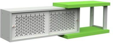 Szafka metalowa podzielona jest na dwie części. Po prawej stronie znajduje się otwarta półka wsparta na dwóch kolumienkach. Wyraziste barwy przyciągają wzrok i stanowią niejako oprawę całości. Po lewej stronie jest szafka z przesuwnymi drzwiczkami. Wnętrze jest przedzielone pośrodku ścianką. …