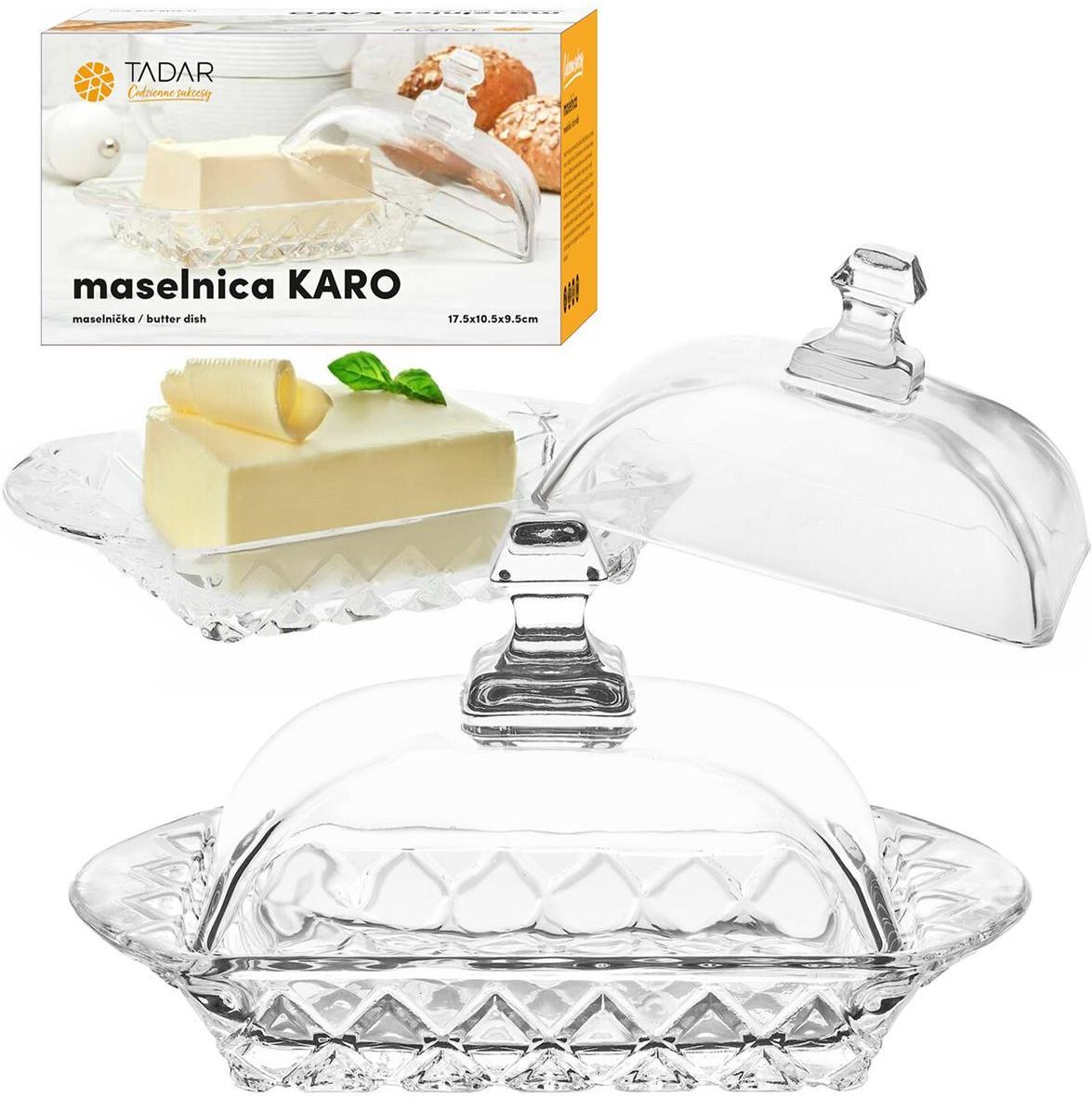 Maselniczka Szklana Tadar Karo Elegancka i Funkcjonalna Maselniczka Tadar Karo to elegancki i praktyczny sposób na przechowywanie masła w każdej kuchni. Dzięki swojej klasycznej formie i subtelnym tłoczonym rombom na podstawie, maselnica doskonale prezentuje się na stole, stanowiąc elegancki element zastawy. Pokrywka z uchwytem skutecznie chroni masło przed zanieczyszczeniami i pomaga utrzymać jego świeżość, co czyni ją niezwykle funkcjonalnym rozwiązaniem na co dzień. Najważniejsze cechy produktu Elegancki kształt z tłoczonymi rombami Pokrywka z uchwytem zapewnia świeżość masła i ochronę przed zanieczyszczeniami Wykonana ze szkła, bezpieczna w kontakcie z żywnością i trwała Nadaje się do przechowywania w lodówce Można myć w zmywarce Elegancki wygląd i stylowy design Maselniczka Tadar Karo charakteryzuje się nowoczesnym, a zarazem ponadczasowym designem, który pasuje do każdego wnętrza. Jej subtelne tłoczone romby w podstawie nadają jej elegancji, czyniąc ją doskonałym wyborem do serwowania masła na stół. Tadar Karo to połączenie estetyki z funkcjonalnością. Praktyczna pokrywka z uchwytem Pokrywka maselniczki wyposażona w uchwyt zapewnia łatwe otwieranie i zamykanie, a także chroni masło przed zanieczyszczeniami. Dzięki niej masło długo pozostaje świeże, a jego smak i tekstura są doskonale zachowane, nawet gdy przechowujesz je w lodówce. Bezpieczna i trwała konstrukcja Maselniczka Tadar Karo wykonana jest z wysokiej jakości szkła, co zapewnia jej trwałość oraz bezpieczeństwo w kontakcie z żywnością. Dzięki solidnemu materiałowi, maselniczka jest odporna na uszkodzenia mechaniczne i posłuży przez długie lata. Przechowywanie w lodówce Maselniczka jest wystarczająco wytrzymała, by przechowywać w niej masło w lodówce. Dzięki jej szczelnej pokrywce, masło nie absorbuje zapachów z innych produktów, co sprawia, że zawsze jest gotowe do użycia, zachowując świeżość przez długi czas.