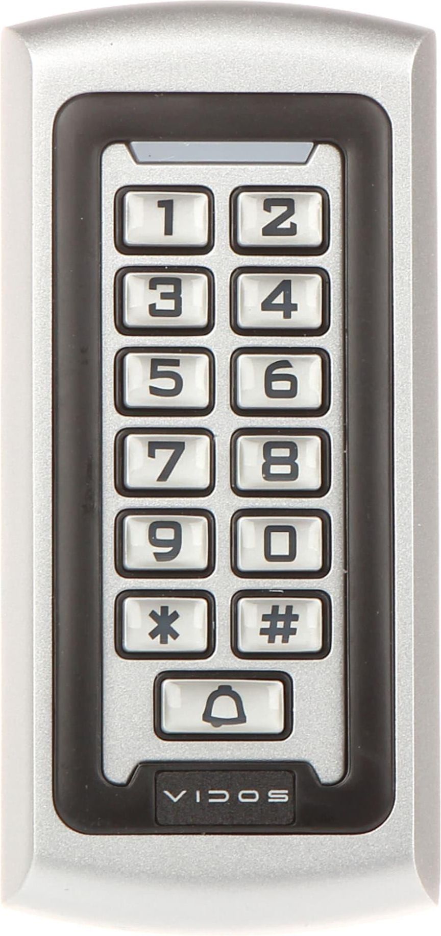 Zamek szyfrowy ZS42 1 VIDOS zasilanie 12V zakres odczytu kart 5 cm IP65 Zewnętrzny, autonomiczny zamek szyfrowy z czytnikiem RFID pracuje w trybie samodzielnym. Otwarcie następuje za pomocą karty RFID lub PINU, a urządzenie potrafi zapamiętać zestaw kart oraz PIN‑ów. Dodatkowo występuje sygnalizacja dźwiękowa i optyczna informująca o stanie systemu. Opcje administratora obejmują programowanie za pomocą klawiatury, dodawanie nowych kart z wprowadzeniem PINU, dodanie nowej karty i PINU, zmianę PINU użytkownika, skasowanie PINU użytkownika, ustawienie czasu zwolnienia blokady oraz przywrócenie ustawień domyślnych. Specyfikacja Obsługa kart: Unique EM 125kHz Zasięg odczytu kart: ~ 5 cm Komunikacja: Wiegand 26 Zasilanie: 12 V DC Maksymalny pobór prądu: 25 mA (tryb czuwania)60 mA (praca) Obciążalność styków przekaźnika: 1 A / 12 V Wybrane cechy: Liczba wyjść przekaźnikowych : 1, 2000 zaindeksowanych użytkowników, Identyfikacja: Karta i/lub PIN Niebieskie podświetlenie przycisków Obsługa elektrozaczepów i zwór elektromagnetycznych Obsługa rygli rewersyjnych Możliwość przyłączenia dzwonka elektromagnetycznego Ochrona antysabotażowa (detekcja oderwania od podłoża oraz otwarcia obudowy) Wyjście alarmowe Wyjście NO/NC Temperatura pracy: -20 °C ... 50 °C Klasa szczelności: IP65 Obudowa: Metalowa, Wandaloodporna Kolor: Srebrny Waga: 0.32 kg Wymiary: 123 x 58 x 23 mm Producent / Marka: VIDOS