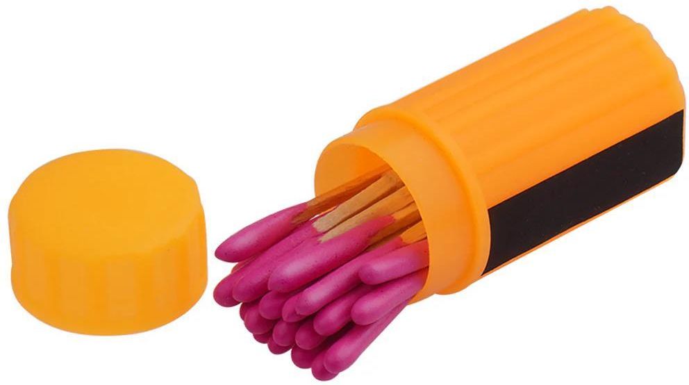 Zapałki wiatro i wodoodporne, przystosowane do działania w trudnych warunkach atmosferycznych. W wodoszczelnym, łatwym do odszukania, pomarańczowym pojemniku znajduje się 20 zapałek pokrytych grubą masą, która zapewnia długi czas palenia bez ryzyka zgaśnięcia.