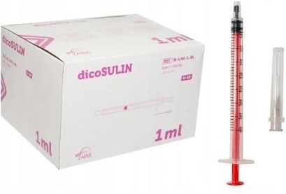 Strzykawka insulinowa dicoSULIN firmy ZARYS sterylna U40 - 40 jednostek Opakowanie: 100szt. Zastosowanie: - strzykawka 3-częściowa do infuzji podskórnych, domięśniowych i dożylnych przeznaczona do podawania insuliny Właściwości: - w komplecie z dopakowaną igłą (0,4 x 13 mm) - przezroczysty cylinder wykonany z polipropylenu umożliwia pełną kontrolę wizualną zawartości - uszczelnienie w postaci podwójnego pierścienia na korku położonym na szczycie tłoka - płynny przesuw tłoka dzięki gumowemu uszczelnieniu - kryza ograniczająca, zabezpieczająca przed przypadkowym wysunięciem tłoka - specjalna konstrukcja tłoczka redukuje pojemność resztkową leku/płynu - wyraźna, czytelna i trwała skala koloru czarnego ułatwiająca dawkowanie - 40 jednostek - nazwa strzykawki oraz logo producenta umieszczona na korpusie strzykawki - czerwony kontrastujący tłok - pojemność 1 ml - jednorazowego użytku - niepirogenna, nietoksyczna - nie zawiera lateksu, nie zawiera ftalanów - sterylizowana tlenkiem etylenu - pakowanie: 1 sztuka/ papier - folia