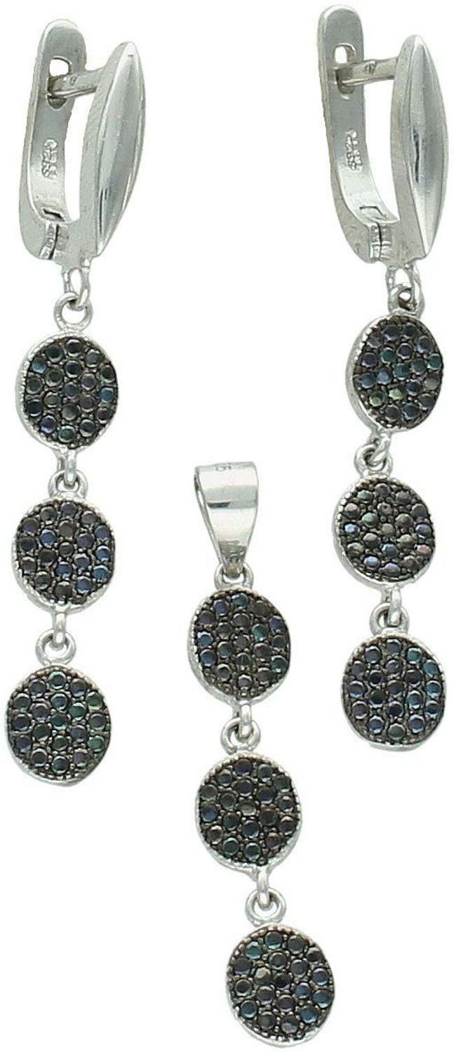 Komplet srebrnej biżuterii z czarną cyrkonią – kolczyki i zawieszka z motywem kółek, Srebro 925 Kleczew