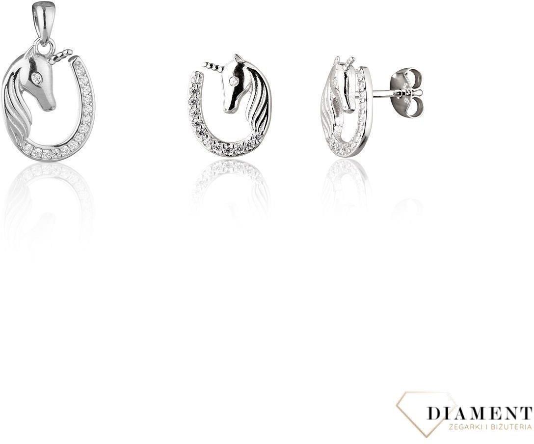 Srebrny komplet zawieszka i kolczyki jednorożce w cyrkoniach. Srebrne kolczyki w kształcie jednorożca w podkowie wysadzone drobnymi cyrkoniami dodają blasku każdej, nawet najprostszej stylizacji. Biżuteria wykonana jest ze srebra próby 925. Będą pięknym prezentem dla dziewczynki kochającej …