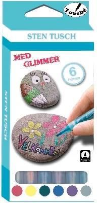 Marker z brokatem do rysowania na kamieniach, zawiera kolory niebieski, srebrny, złoty, czerwony, fioletowy i zielony. Oczyść kamień z piasku, soli itp. Przed użyciem dokładnie wstrząsnąć pisakami i 2-3 razy docisnąć końcówkę. Pokoloruj kamień i pozwól mu wyschnąć przed narysowaniem np. kropek. Nałożyć z powrotem nasadkę po użyciu, aby nie wyschła. Aby zabezpieczyć kolor, warto polakierować kamień lub nałożyć na niego warstwę uniwersalnego kleju hybrydowego/lakieru.