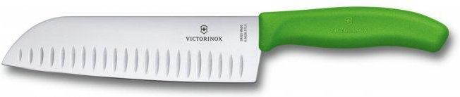 Victorinox Santoku Swiss Classic 17 cm z czerwonymi wycięciami: to wszechstronny nóż kuchenny w popularnym kształcie santoku, wzorowany na tradycyjnych nożach japońskich, ale ze zmodyfikowaną rękojeścią w stylu europejskim. Jest przeznaczony do wszechstronnej pracy w kuchni. Można go używać do mięsa, cebuli i warzyw. Długość ostrza wynosi 17 cm. Wgłębienia na szerokim ostrzu zapobiegają niepożądanemu przywieraniu krojonego materiału do noża. Nóż jest dobrze wyważony.Ergonomicznie ukształtowana rękojeść wykonana jest z termoplastycznego elastomeru, dzięki czemu jest higieniczna, a jednocześnie łatwa do trzymania w każdych warunkach. Ten nóż kuchenny jest przeznaczony dla amatorów i profesjonalnych kucharzy. Zafunduj sobie wysokiej jakości nóż od solidnego producenta sprawdzonego przez wiele lat. Każde ostrze jest osobiście testowane przez pracownika. Stal Dauphinox - to wysokiej jakości stal nierdzewna. Zawiera węgiel C 0,48 - 0,52%, chrom Cr 14,5 - 15%, mangan Mn 0,4 - 0,5%, krzem Si 0,5 - 0,6%, molibden Mo 0,4 - 0,6%. Ostrza mają twardość 56 RC po hartowaniu w 1040°C i odpuszczaniu w 160°C. Piły do drewna, nożyczki i pilniki do paznokci mają twardość 53 RC, śrubokręty, otwieracze do butelek, szydła 52 RC, korkociągi 49 RC SwissClassic, nóż Santoku, ścięta krawędź, 17 cm, zielony, opakowanie blistrowe