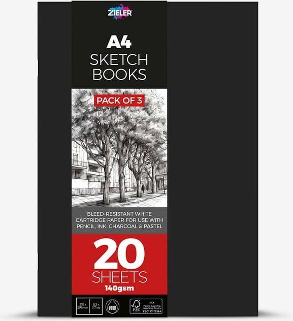 The Zieler A4 Sketchbook Softcover Pack of 3 provides three compact, portable books, each with 20 sheets of smooth white 140gsm paper under a classic black, heavy card cover. Designed for everyday drawing and on-the-go studies, they’re ideal for quick sketches, class notes, or travel journalling. The stapled binding keeps pages secure while the acid-free paper supports clean lines, subtle shading, and light washes without fuss. Suitable for all levels - from school and college to studio practice - these versatile books handle a range of media, including pencil, charcoal, graphite, pastel, ink, and water-based markers, with ease. Zieler are a family-run company who have been selling art supplies for 30 years, before deciding to make their own art materials in 2017. They work with talented artists who thoroughly test their products to ensure they are of the right quality. The artists rule out any product which is not up to their high standards. Ideal for beginner artists.