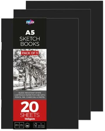 The A5 Sketchbook pack by Zieler contains 3 books of 20 sheets of smooth white 140 gsm paper in a classic black, heavy-carded cover. It's perfect for a wide range of media uses including all types of drawing and sketching plus light washes. A5 size - 148.5 x 210mm Smooth soft white color paper, 140 gsm, stapled to keep your work secure. Carded cover to help keep your protected. Suitable for various media uses including pencil, charcoal, graphite, pastel, ink, water-based markers and light washes. Ideal for travel and quick sketches. Suitable for all levels - ideal for school, college and university students as well as artists. Available in A4 and A5. Acid-free